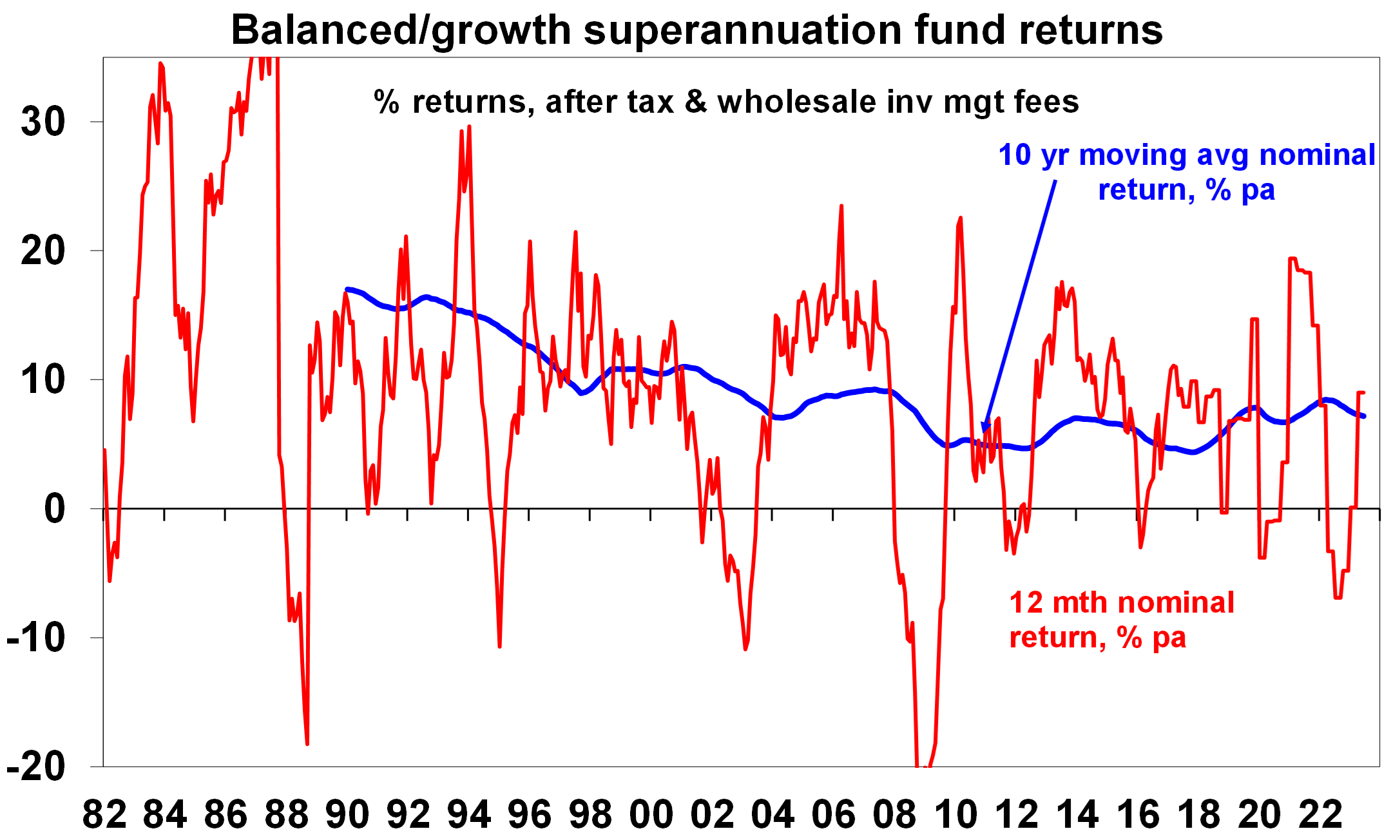 The last few financial years has seen a bit of a zig zag pattern in returns with average super funds seeing losses in 2019-20 (as the pandemic hit), very strong returns in 2020-21 (as markets rebounded), a loss in 2021-22 (as inflation and bond yields surged) and now a rebound. Given the volatility it’s best to focus on their longer term average returns which have been 7.2% pa over the last decade or around 4.5% pa after inflation.