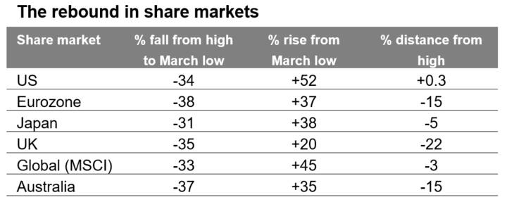 Share markets have had a spectacular rebound from their March lows. The rebound has been led by the US share market which is up 52% and has just risen above its February record high, making it the fastest recovery after a 30% or more fall on record.